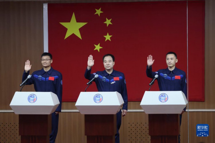 5月29日,神舟十六號航天員乘組與中外媒體記者集體見面會在酒泉衛星發射中心問天閣舉行。這是指令長景海鵬(中)、航天飛行工程師朱楊柱(右)、載荷專家桂海潮揮手致意。