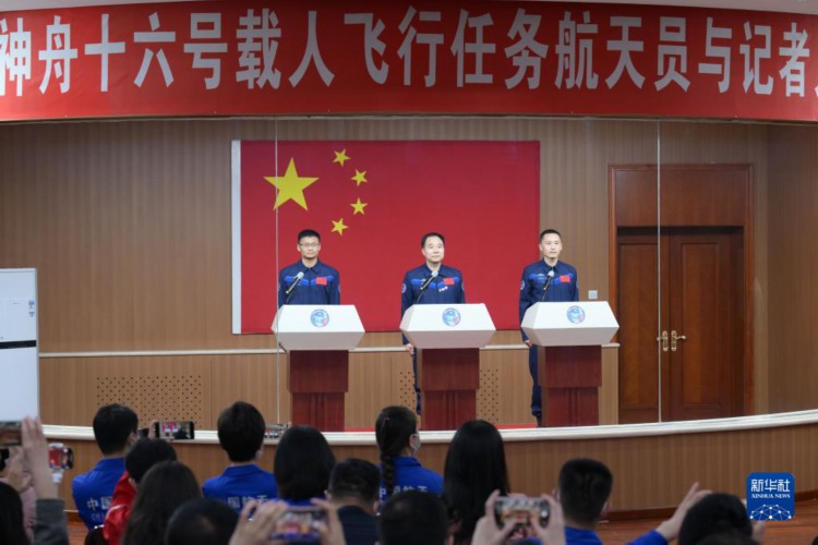 5月29日,神舟十六號航天員乘組與中外媒體記者集體見面會在酒泉衛星發射中心問天閣舉行。這是指令長景海鵬(中)、航天飛行工程師朱楊柱(右)、載荷專家桂海潮回答記者提問。