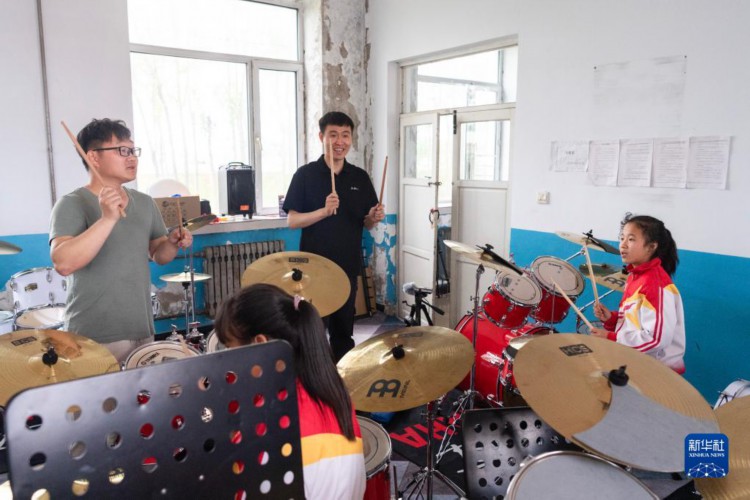 5月29日,在安達市任民鎮中心小學,音樂老師教音樂班的孩子打架子鼓。