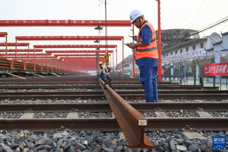 6月1日,中鐵十一局工程技術人員在杭溫鐵路義烏鋪軌基地堆碼500米長鋼軌。