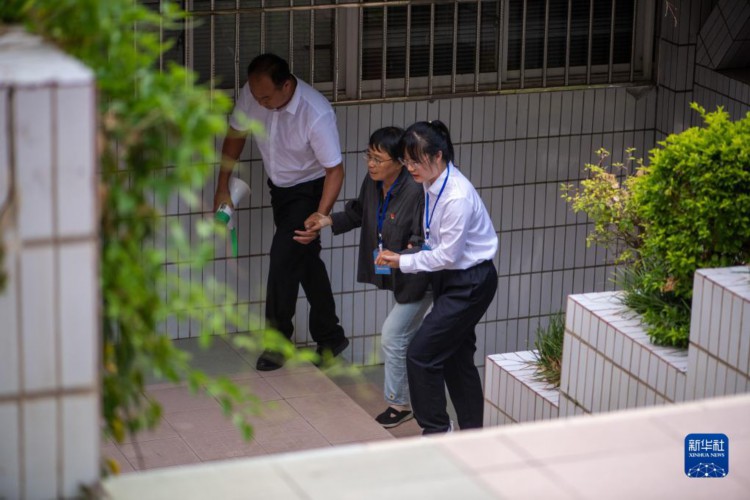 6月7日,張桂梅(中)在同事的攙扶下進入考點。 6月7日是2023年高考首日,張桂梅又是一大早提前來到教學樓,等候學生們前來早讀,叮囑考生們帶好考試用品。自云南麗江華坪女子高中的學生2011年首次參加高考以來,張桂梅校長每年都要送考,這一送就是13年。 新華社記者 江文耀 攝