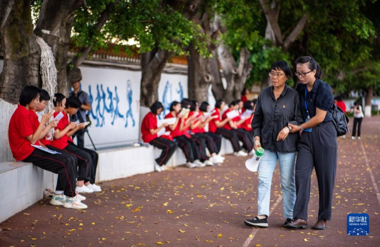 6月7日,張桂梅在同事的攙扶下進入考點。考場外,學生們正在抓緊看書。 6月7日是2023年高考首日,張桂梅又是一大早提前來到教學樓,等候學生們前來早讀,叮囑考生們帶好考試用品。自云南麗江華坪女子高中的學生2011年首次參加高考以來,張桂梅校長每年都要送考,這一送就是13年。 新華社記者 江文耀 攝