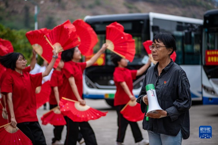 6月7日,張桂梅帶著低年級學生給準備出發參加高考的同學們加油鼓勁。 6月7日是2023年高考首日,張桂梅又是一大早提前來到教學樓,等候學生們前來早讀,叮囑考生們帶好考試用品。自云南麗江華坪女子高中的學生2011年首次參加高考以來,張桂梅校長每年都要送考,這一送就是13年。 新華社記者 江文耀 攝