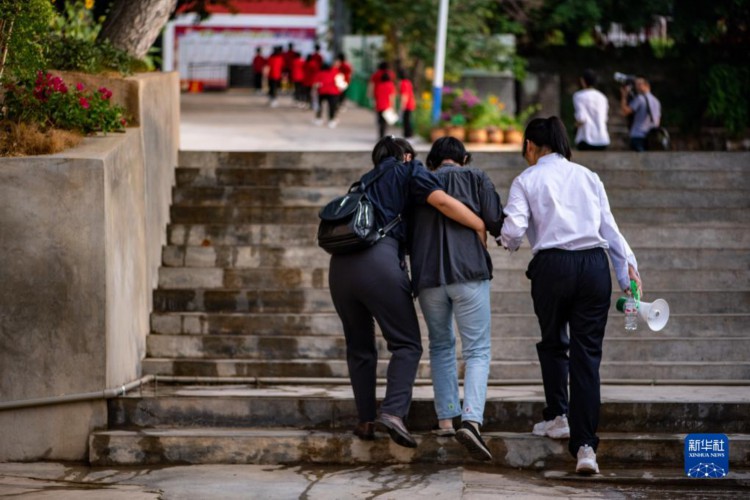 6月7日,張桂梅在同事的攙扶下進入考點。 6月7日是2023年高考首日,張桂梅又是一大早提前來到教學樓,等候學生們前來早讀,叮囑考生們帶好考試用品。自云南麗江華坪女子高中的學生2011年首次參加高考以來,張桂梅校長每年都要送考,這一送就是13年。 新華社記者 江文耀 攝