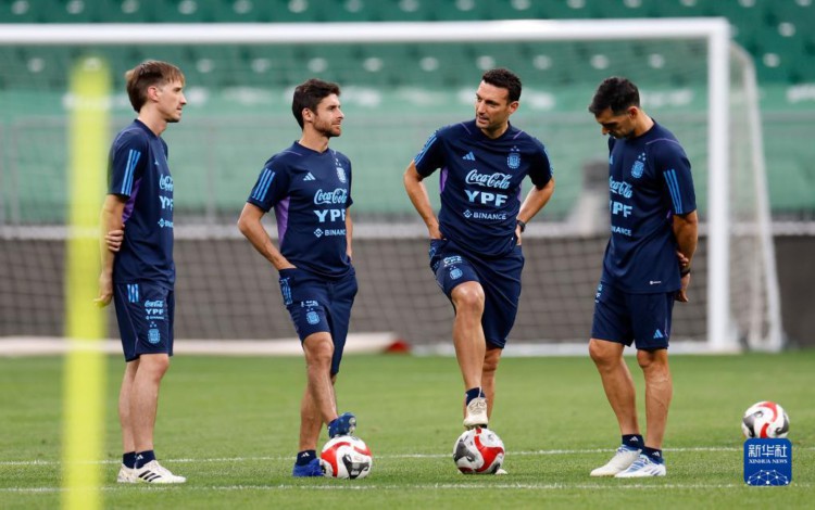 6月14日,阿根廷隊主教練斯卡洛尼(右二)在訓練中。新華社記者 王麗莉 攝