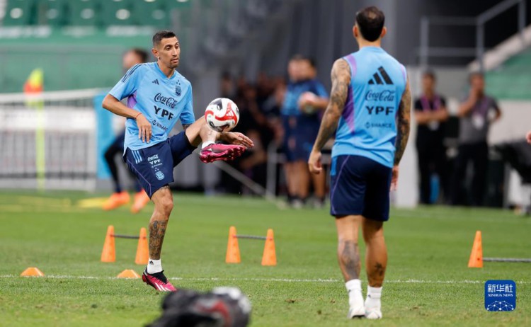 6月14日,阿根廷隊球員迪瑪利亞(左)在訓練中。新華社記者 王麗莉 攝