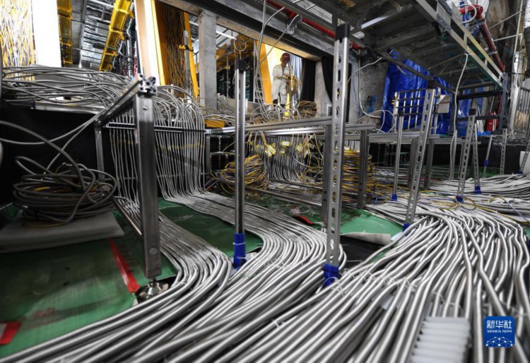 6月15日,工作人員在江門中微子實驗地下大廳內布線。 江門中微子實驗位于廣東省江門開平市,是由中科院和廣東省共同建設的大科學裝置,以測定中微子質量順序、精確測量中微子混合參數為主要科學目標,并進行其他多項科學前沿研究。 地下探測器目前已完成不銹鋼網架安裝,預計2024年建成運行,屆時將成為國際中微子研究的中心之一。 新華社記者 鄧華 攝