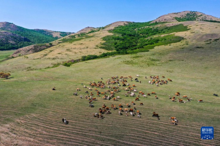 6月14日,牛群在草原上覓食。 夏日,內蒙古阿魯科爾沁草原綠意盎然,牛羊在草原上覓食,景色如畫。 新華社記者 連振 攝
