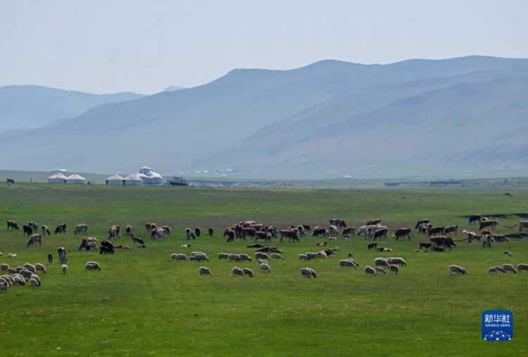 6月15日拍攝的阿魯科爾沁草原景色。 夏日,內蒙古阿魯科爾沁草原綠意盎然,牛羊在草原上覓食,景色如畫。 新華社記者 連振 攝