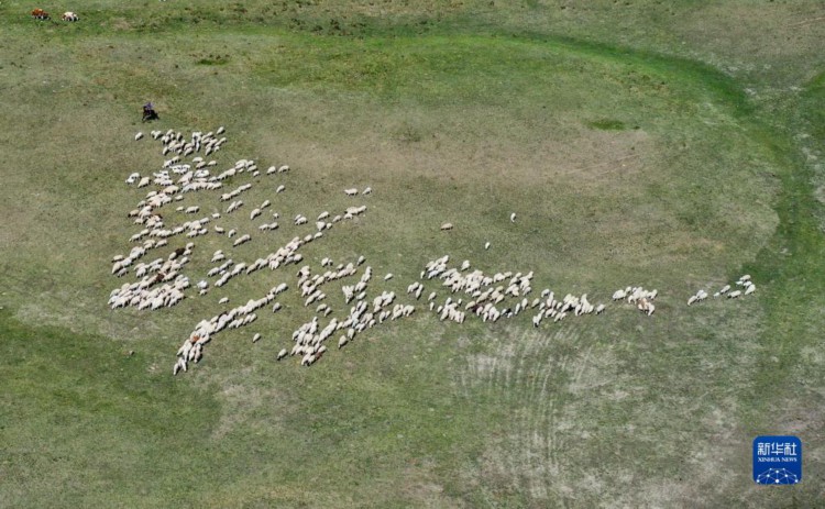 6月15日,羊群在草原上覓食(無人機照片)。 夏日,內蒙古阿魯科爾沁草原綠意盎然,牛羊在草原上覓食,景色如畫。 新華社記者 連振 攝