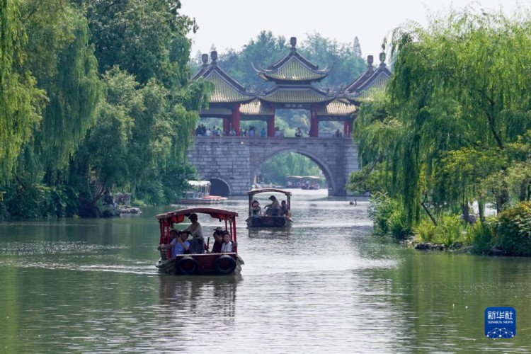 游客乘船在揚州瘦西湖風景區內參觀游玩(6月15日攝)。