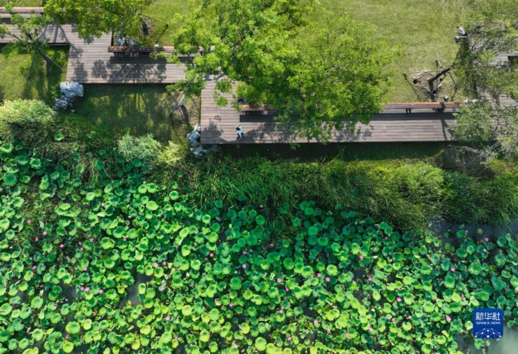 市民在揚州運河三灣風景區晨練(6月15日攝,無人機照片)。