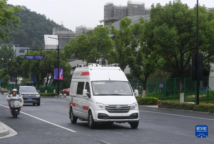 6月25日,在位于杭州臨安區的杭州亞運會場館周邊,一輛走航監測車在進行走航監測。走航監測作為大氣環境監測的高科技方式,實現在行駛過程中對有機廢氣物進行快速監測,對污染源進行定位跟蹤。