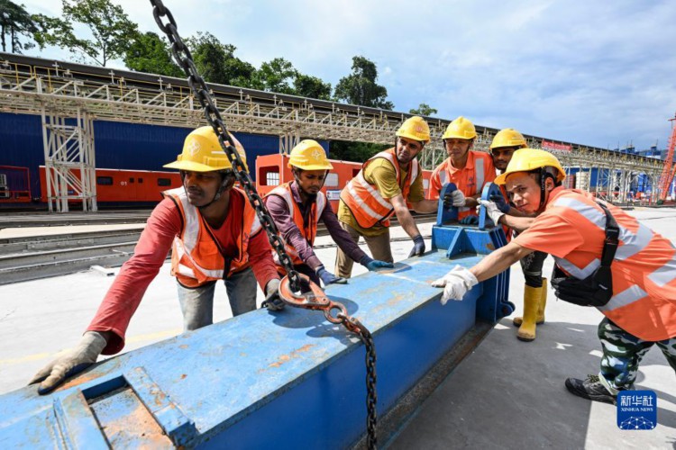 6月28日,在位于馬來西亞彭亨州的馬東鐵項目云頂隧道施工現場附近,幾名工人合力作業。