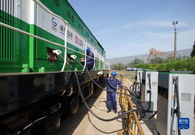 7月6日,在秦皇島港港區內,工人在給秦皇島港新能源1號機車充電。