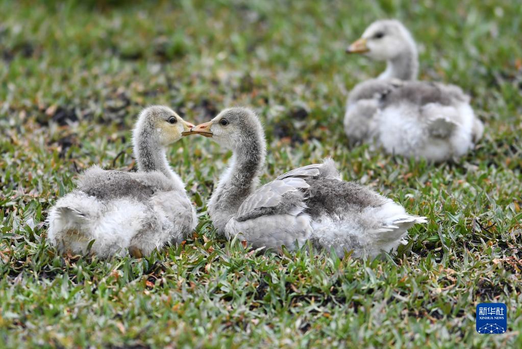 斑頭雁幼鳥在尕海濕地嬉戲(7月7日攝)。