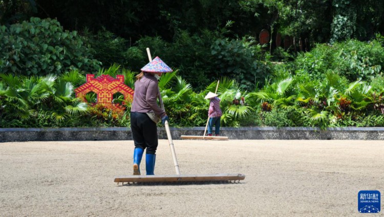 7月10日,毛納村村民在廣場上晾曬稻谷。 三伏將至,海南省五指山市水滿鄉毛納村村民搶抓農時晾曬稻谷,田間地頭一派繁忙。 新華社記者 楊冠宇 攝