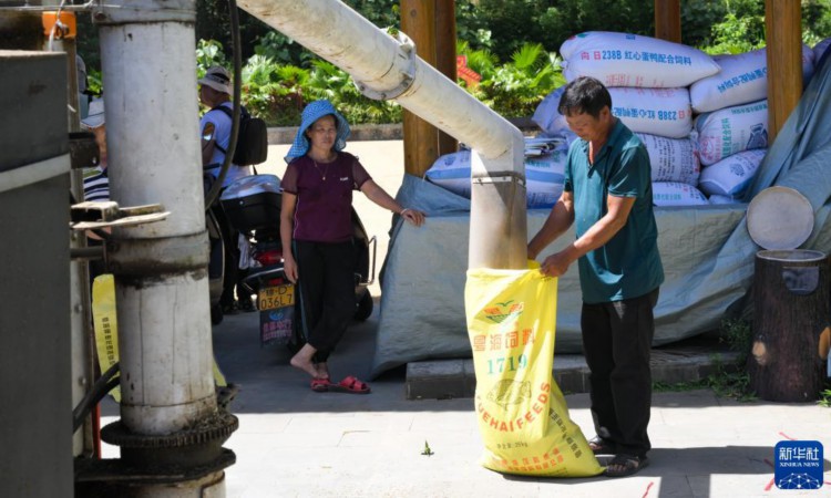7月10日,毛納村村民將稻谷裝袋。 三伏將至,海南省五指山市水滿鄉毛納村村民搶抓農時晾曬稻谷,田間地頭一派繁忙。 新華社記者 楊冠宇 攝