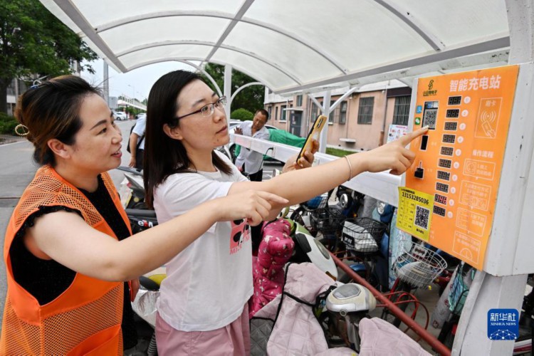 7月11日,在青島膠州市九龍街道一電動自行車集中充電點,社區工作人員指導車主掃碼充電。 2022年以來,山東青島膠州市在城市更新和城市建設中,著眼于破解居民小區電動自行車數量多、樓道內亂停亂放、飛線充電等問題,探索建立電動自行車集中充電長效機制,在全市陸續建設900個電動自行車集中充電點(棚),既為居民提供了便利,也保障了群眾人身和財產安全。新華社記者 李紫恒 攝