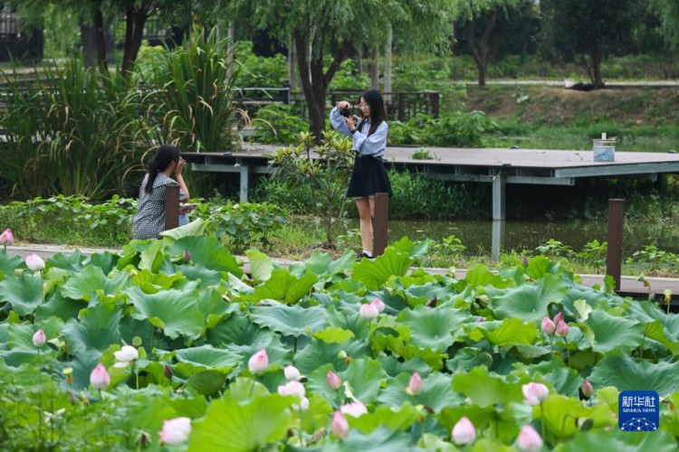 7月18日,游客在杭州富陽廣吉生態農業基地的荷花池邊拍照。位于杭州市富陽區銀湖街道坑西村的廣吉生態農業基地是由回歸的新鄉賢創辦,是一家集水產養殖、垂釣、餐飲、觀光于一體的農文旅休閑產業基地。