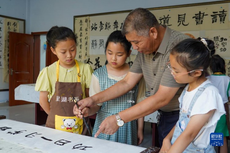 7月19日,在無(wú)棣縣棣豐街道星湖社區(qū)服務(wù)中心,志愿者教孩子們寫毛筆字。 為緩解暑期少年兒童看護(hù)難題、豐富少年兒童文化生活,山東省無(wú)棣縣利用社區(qū)黨群服務(wù)中心、新時(shí)代文明實(shí)踐中心等平臺(tái),將多功能室、圖書室、書畫室等文化功能室打造成公益托管課堂,并組織志愿者開(kāi)展形式多樣的活動(dòng),讓孩子們樂(lè)享暑期生活。 新華社記者 朱崢 攝