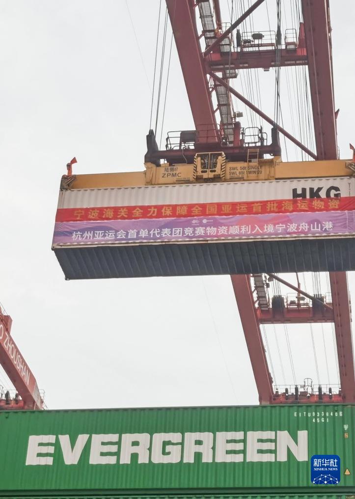 7月20日,吊車在寧波舟山港運(yùn)輸?shù)礁鄣闹袊?guó)香港代表團(tuán)競(jìng)賽物資。 當(dāng)日,中國(guó)香港代表團(tuán)首批參賽制服和競(jìng)賽物資分別從杭州蕭山國(guó)際機(jī)場(chǎng)和寧波舟山港通關(guān),這標(biāo)志著杭州亞運(yùn)會(huì)首批代表團(tuán)物資通過(guò)海空兩路運(yùn)抵入境。 新華社發(fā)