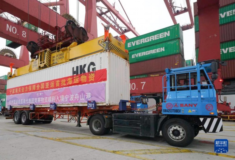 7月20日,集卡在寧波舟山港運(yùn)輸?shù)礁鄣闹袊?guó)香港代表團(tuán)競(jìng)賽物資。 當(dāng)日,中國(guó)香港代表團(tuán)首批參賽制服和競(jìng)賽物資分別從杭州蕭山國(guó)際機(jī)場(chǎng)和寧波舟山港通關(guān),這標(biāo)志著杭州亞運(yùn)會(huì)首批代表團(tuán)物資通過(guò)海空兩路運(yùn)抵入境。 新華社發(fā)