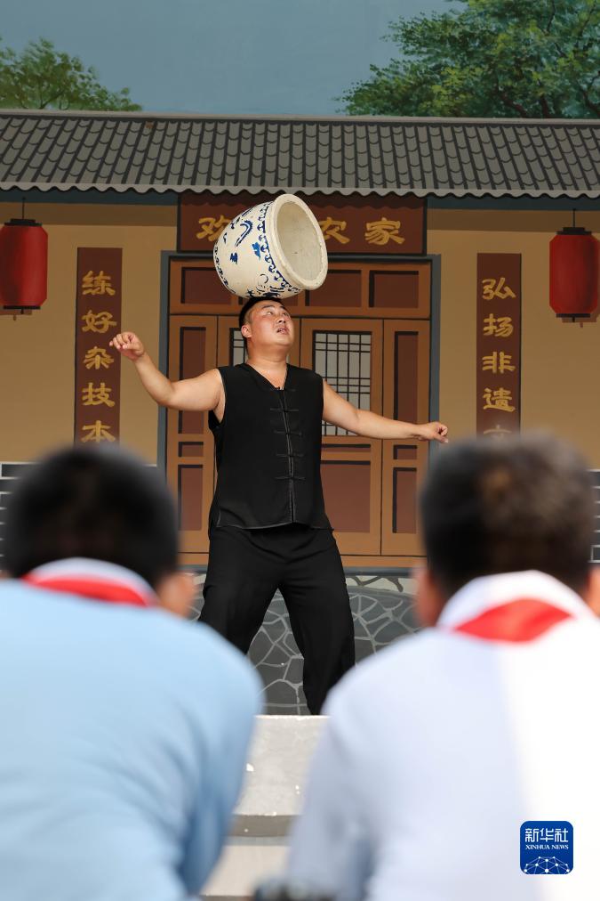 7月20日,在河北省滄州市吳橋縣吳橋雜技大世界景區(qū),雜技演員為吳橋縣新興路小學學生展示傳統(tǒng)雜技項目。