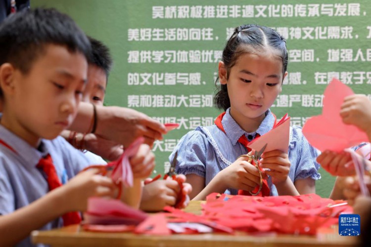 7月20日,在河北省滄州市吳橋縣大運河文化展館,吳橋縣實驗小學學生學習吳橋雜技剪紙技藝。