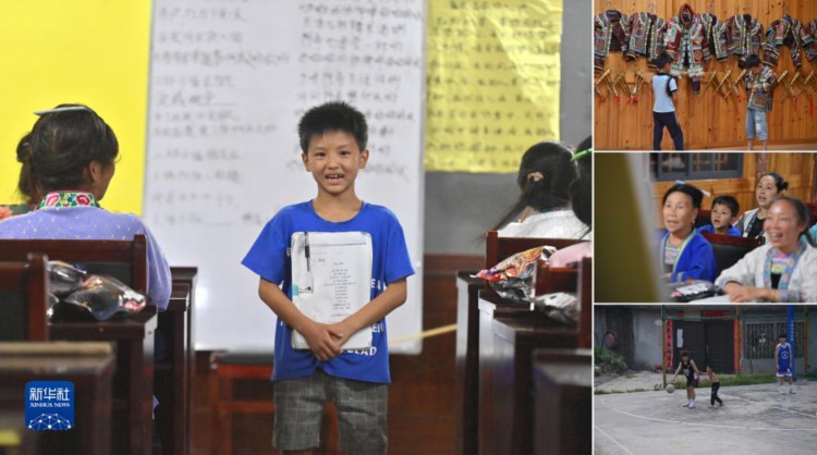 拼版照片:左圖為廣西融水苗族自治縣桿洞鄉黨鳩村烏英苗寨8歲的小學生吳良友(7月6日攝);右上圖為吳良友(左)在民俗活動前等待更換民族服飾(7月6日攝);右中圖為吳良友跟著媽媽在夜校學習唱苗歌(7月5日攝);右下圖為吳良友(左二)和哥哥在打籃球(7月15日攝)。暑假期間,吳良友經常跟媽媽到夜校學習唱苗歌。 暑假期間,廣西各地充分發揮少數民族傳統文化資源豐富的優勢,通過非遺公益培訓、民族文化進鄉村、舉辦民俗體驗活動等,引導小學生積極學習蘆笙、民歌、蠟染、刺繡、陀螺等非遺文化項目,讓他們在豐富多彩的假期活動中,增強對非物質文化遺產的保護和傳承意識。 新華社記者 黃孝邦 攝 |