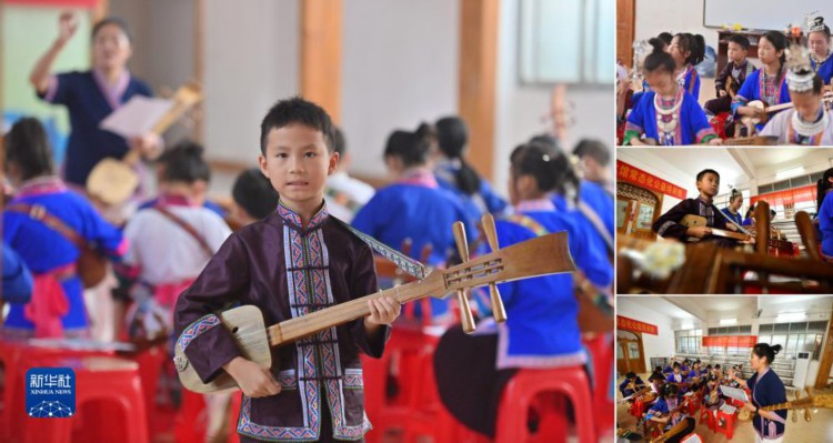 拼版照片:左圖為廣西三江侗族自治縣9歲的小學生潘文祥;右圖為潘文祥在縣文化館非遺公益培訓班上學習彈唱侗族琵琶歌(照片均攝于7月13日)。暑假期間,三江侗族自治縣文化館舉辦侗族琵琶歌公益培訓班,喜歡吹奏侗族樂器的潘文祥報名參加。