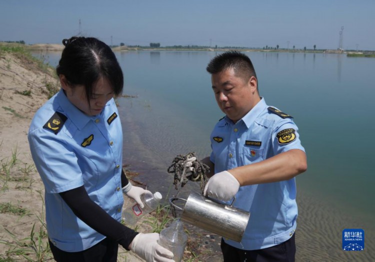 7月25日,河北省新樂市環(huán)保局工作人員在大沙河提取水樣,準(zhǔn)備進(jìn)行檢測(cè)。