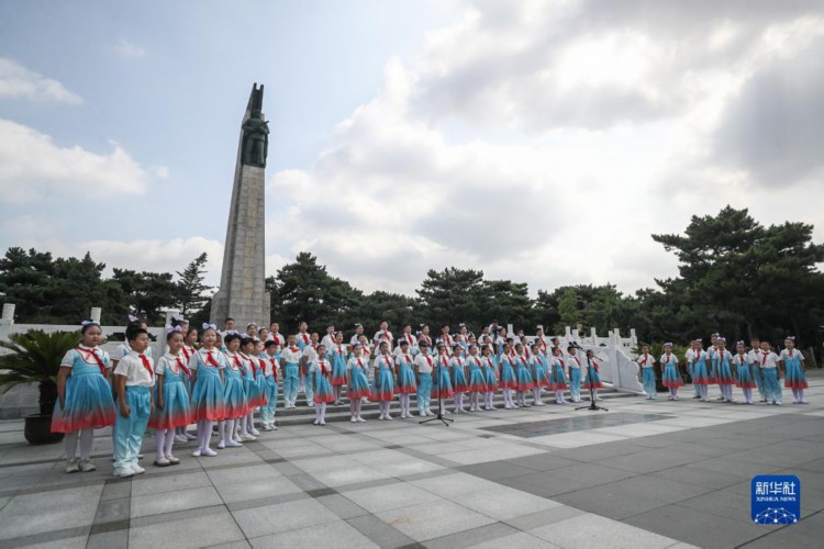 7月27日,來自中國少年先鋒隊沈陽雷鋒朗誦團的孩子們在紀念碑前朗誦《誰是最可愛的人》(節選)。
