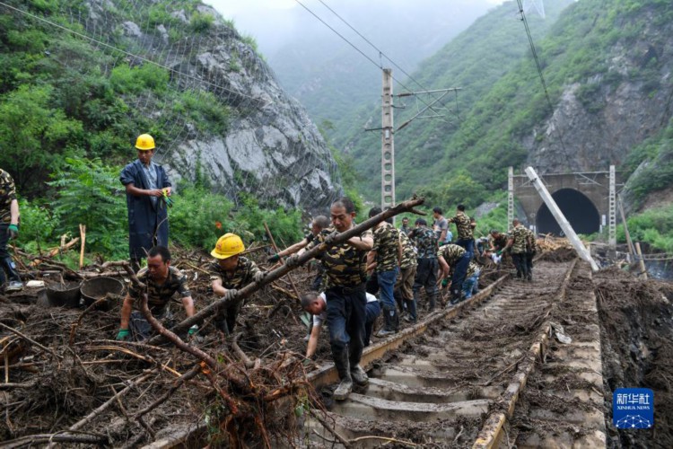 8月1日,在北京市門頭溝區(qū)水峪嘴村附近一段被阻斷的鐵路線上,中鐵六局工作人員在清理軌道上的雜物,全力恢復(fù)交通。 受臺(tái)風(fēng)“杜蘇芮”影響,北京自7月29日開始連續(xù)強(qiáng)降雨,西部、西南部、南部遭遇特大暴雨。位于北京市西部的門頭溝區(qū)部分區(qū)域發(fā)生山洪災(zāi)害,記者在一線直擊救援現(xiàn)場(chǎng)。 新華社記者 鞠煥宗 攝