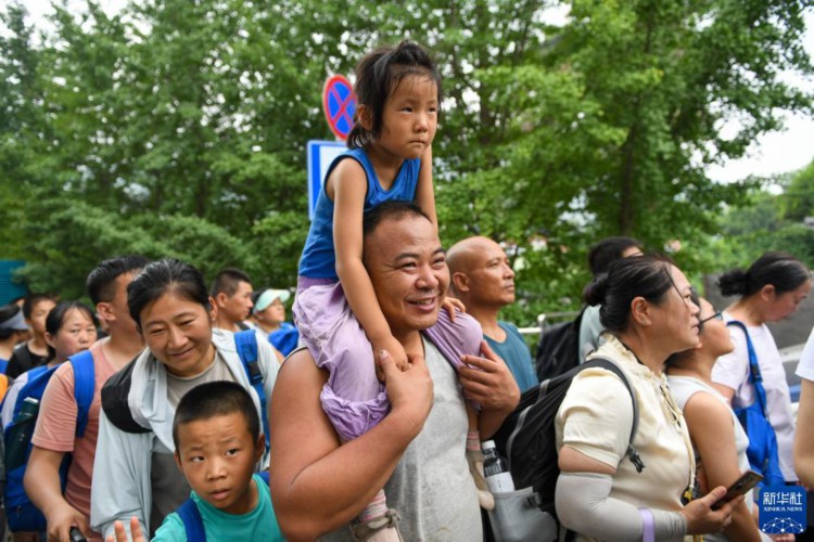 8月2日,在北京市門頭溝區妙峰山鎮政府附近,旅客排隊準備乘坐大巴車。