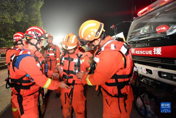 8月9日凌晨,在天津市靜海區臺頭鎮,天津消防救援總隊的消防員在巡查前互相整理裝備。 近期,位于天津市靜海區的大清河臺頭段水位持續上漲,臺頭鎮等地防洪形勢嚴峻。根據最新測報,截至8月9日上午10時,大清河臺頭水位接近6米,接近洪水預測的峰值。 連日來,消防救援人員、公安干警、鎮村干部、留守人員等晝夜開展村莊及河堤巡查、岸堤加固等防洪作業,做好處置突發險情的各項準備,全力保障大清河堤防安全,守護臺頭鎮全鎮18個村的平安。 新華社記者 孫凡越 攝