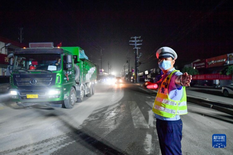 8月9日凌晨,交警在天津市靜海區臺頭鎮一處十字路口指揮工程車輛進入作業現場。 近期,位于天津市靜海區的大清河臺頭段水位持續上漲,臺頭鎮等地防洪形勢嚴峻。根據最新測報,截至8月9日上午10時,大清河臺頭水位接近6米,接近洪水預測的峰值。 連日來,消防救援人員、公安干警、鎮村干部、留守人員等晝夜開展村莊及河堤巡查、岸堤加固等防洪作業,做好處置突發險情的各項準備,全力保障大清河堤防安全,守護臺頭鎮全鎮18個村的平安。 新華社記者 孫凡越 攝