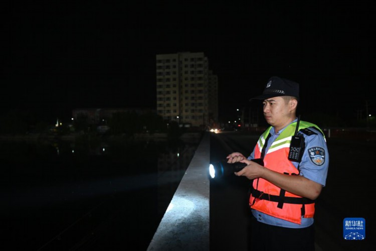 8月9日凌晨,在天津市靜海區臺頭鎮革命橋上,天津市公安局靜海分局執勤民警查看大清河河面情況。 近期,位于天津市靜海區的大清河臺頭段水位持續上漲,臺頭鎮等地防洪形勢嚴峻。根據最新測報,截至8月9日上午10時,大清河臺頭水位接近6米,接近洪水預測的峰值。 連日來,消防救援人員、公安干警、鎮村干部、留守人員等晝夜開展村莊及河堤巡查、岸堤加固等防洪作業,做好處置突發險情的各項準備,全力保障大清河堤防安全,守護臺頭鎮全鎮18個村的平安。 新華社記者 孫凡越 攝