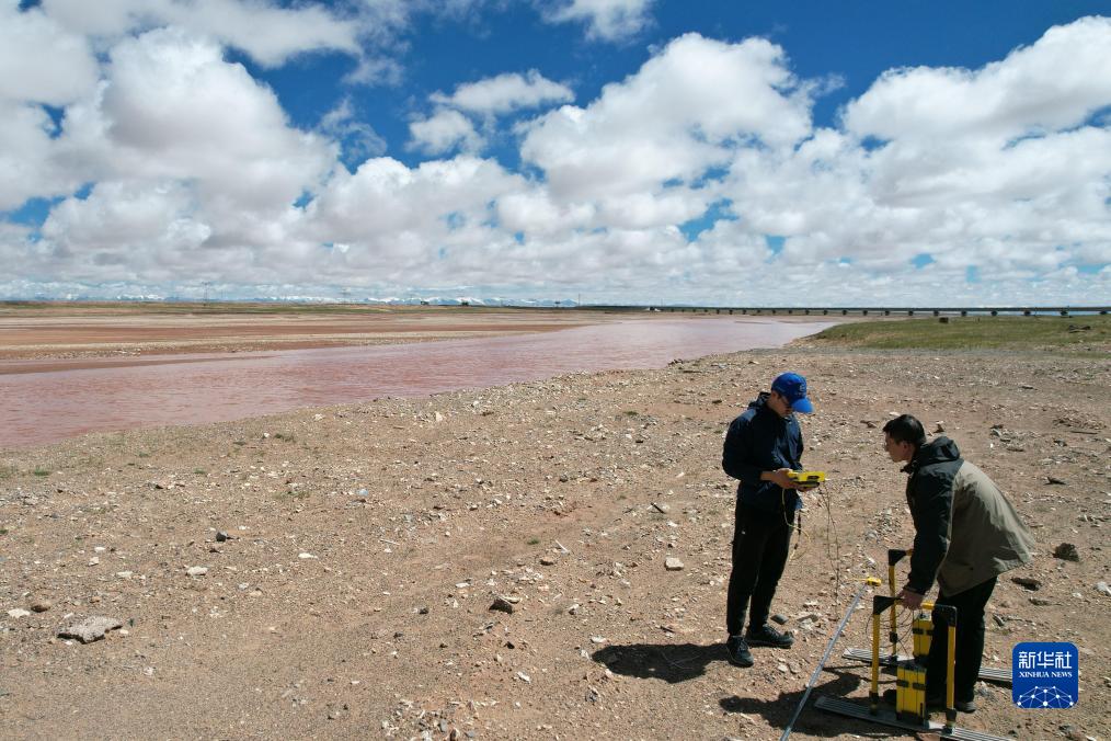 科考隊員在楚瑪爾河辮狀河道岸邊進行科考作業(7月29日攝)。