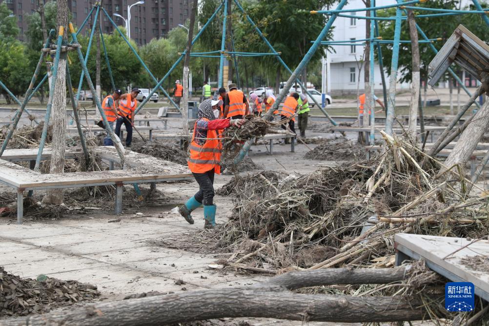 8月11日,在黑龍江省尚志市尚志大街附近,環衛工人清理洪水沖來的雜物。