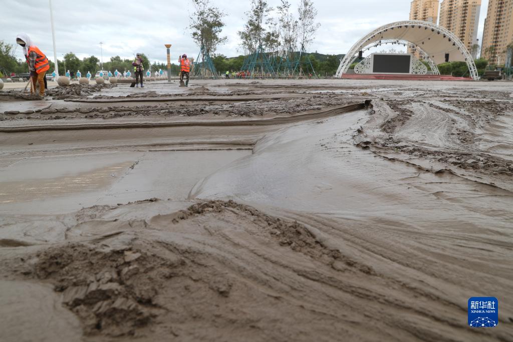 8月11日,在黑龍江省尚志市尚志大街附近,環(huán)衛(wèi)工人在清理淤泥。