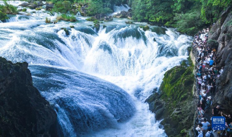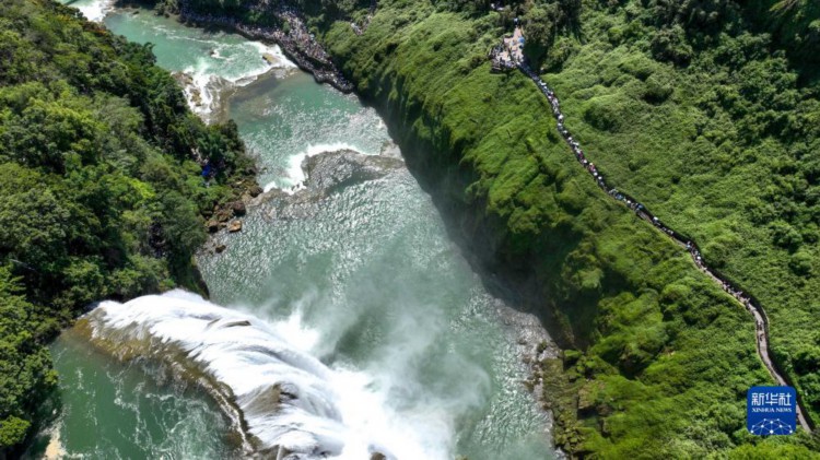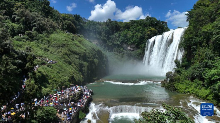 8月16日,貴州省安順市黃果樹瀑布景區游人如織(無人機照片)。 初秋時節,位于貴州省安順市的黃果樹瀑布景區進入一年中的最佳觀賞期。大瀑布奔騰而下、氣勢磅礴,前來觀賞游玩的游客絡繹不絕。 新華社記者 楊楹 攝