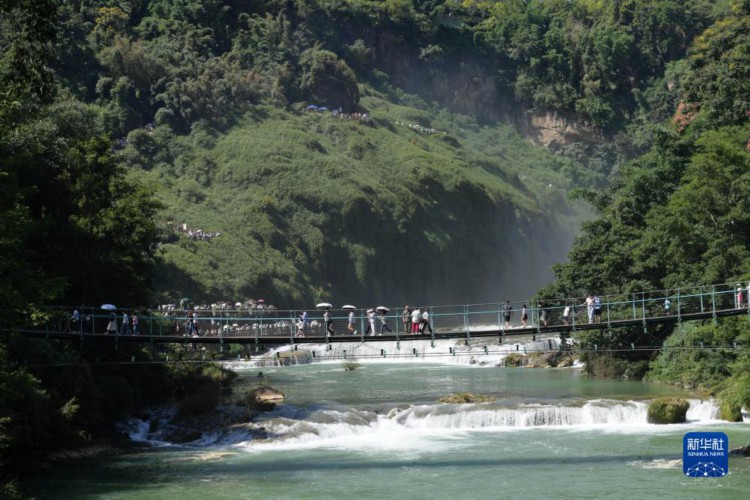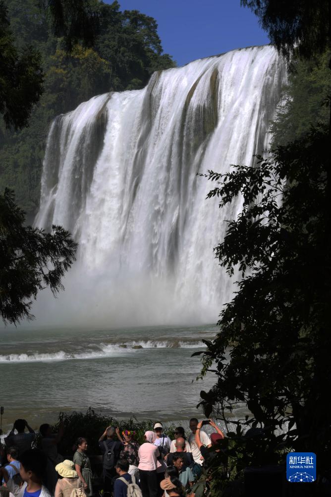 8月16日,游客在貴州省安順市黃果樹瀑布景區游覽。 初秋時節,位于貴州省安順市的黃果樹瀑布景區進入一年中的最佳觀賞期。大瀑布奔騰而下、氣勢磅礴,前來觀賞游玩的游客絡繹不絕。 新華社記者 楊楹 攝