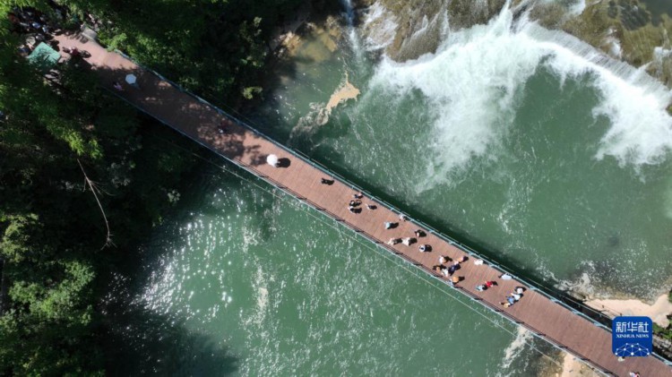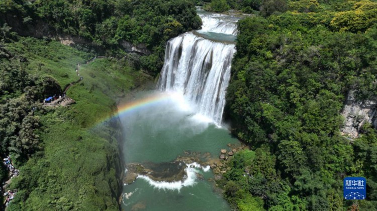 8月16日,游客在貴州省安順市黃果樹瀑布景區游覽(無人機照片)。 初秋時節,位于貴州省安順市的黃果樹瀑布景區進入一年中的最佳觀賞期。大瀑布奔騰而下、氣勢磅礴,前來觀賞游玩的游客絡繹不絕。 新華社發(陳熙 攝)