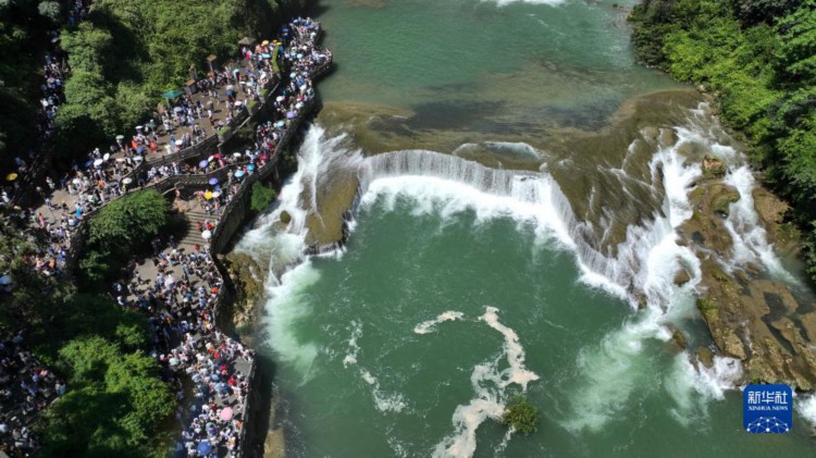 8月16日,游客在貴州省安順市黃果樹瀑布景區(qū)游覽(無人機(jī)照片)。