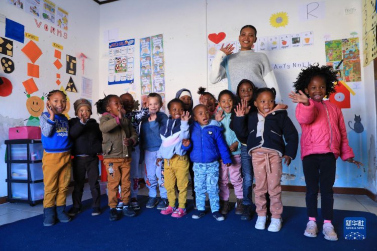8月11日,老師與孩子們在南非德阿鎮的一家兒童早教中心合影。