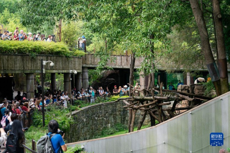8月21日,游客在美國首都華盛頓史密森學會國家動物園觀看大熊貓幼崽“小奇跡”過生日。 在美國首都華盛頓史密森學會國家動物園出生的雄性大熊貓幼崽“小奇跡”21日迎來3歲生日。 新華社記者 劉杰 攝