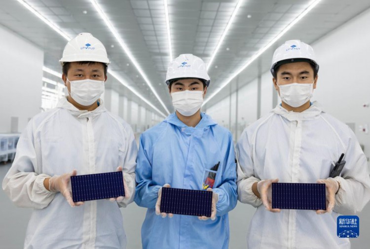 8月22日,在四川省丹棱縣經濟開發區的眉山璉升光伏8GW高效異質結電池項目電池車間,員工手捧第一批下線的異質結電池成品。 當日,位于四川省丹棱縣經濟開發區的眉山璉升光伏8GW高效異質結電池項目投產,首片高效異質結太陽能電池片正式下線。眉山璉升光伏8GW高效異質結太陽能電池項目,總投資達45億元,是四川省2023年重點建設項目。 新華社記者 江宏景 攝