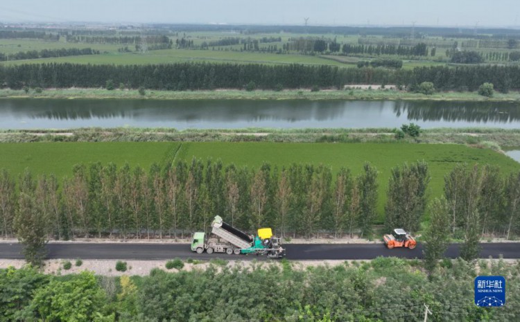 8月23日,工人在唐山市豐南區(qū)陡河沿岸鄉(xiāng)村公路建設(shè)工地施工(無人機照片)。