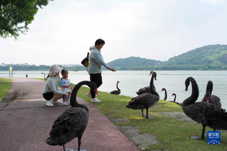 8月23日,游客在位于八里店鎮的西山漾國家城市濕地公園和棲息于此的黑天鵝互動。